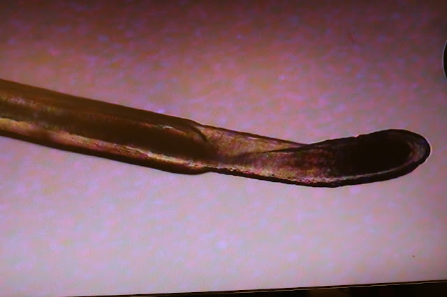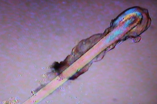 Luennon jälkeen minulle tehtiin hiustutkimus, joka kesti noin kaksi tuntia. Päänahasta irrotettiin eri kohdista hiuksia ja niitä tutkittiin mikroskoopilla (postauksen kuvat). En kärsi päänahan ongelmista enkä myöskään rajusta hiusten lähdöstä vaikka hiukseni ovat kyllä viime vuosien aikana ohentuneet. Hiuksia irtoaa pesun yhteydessä jonkun verran, mutta myös uusia baby hiuksia kasvaa koko ajan lisää. Stressi vaikuttaa hiuksiin voimakkaasti ja sitä minulla viime syksynä todellakin oli paljon. Stressin takia pääsi mykoplasmakin puhkeamaan, mikä tietenkin laskee vastustuskykyä. Eli olin ihan varma, että jotakin häiriöitä tutkija tulee hiusjuurista löytämään.