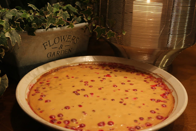 Sekoita kulhossa kaikki muut aineosat keskenään paitsi puolukat. Ripottele puolukat esipaistetulle pohjalle ja kaada täyteseos puolukoiden päälle. Tasoita lusikalla tasaiseksi. Paista 175 asteessa 30 minuuttia. Laita jäähtynyt piirakka vetäytymään jääkaappiin joksikin aikaa ennen tarjoilua.