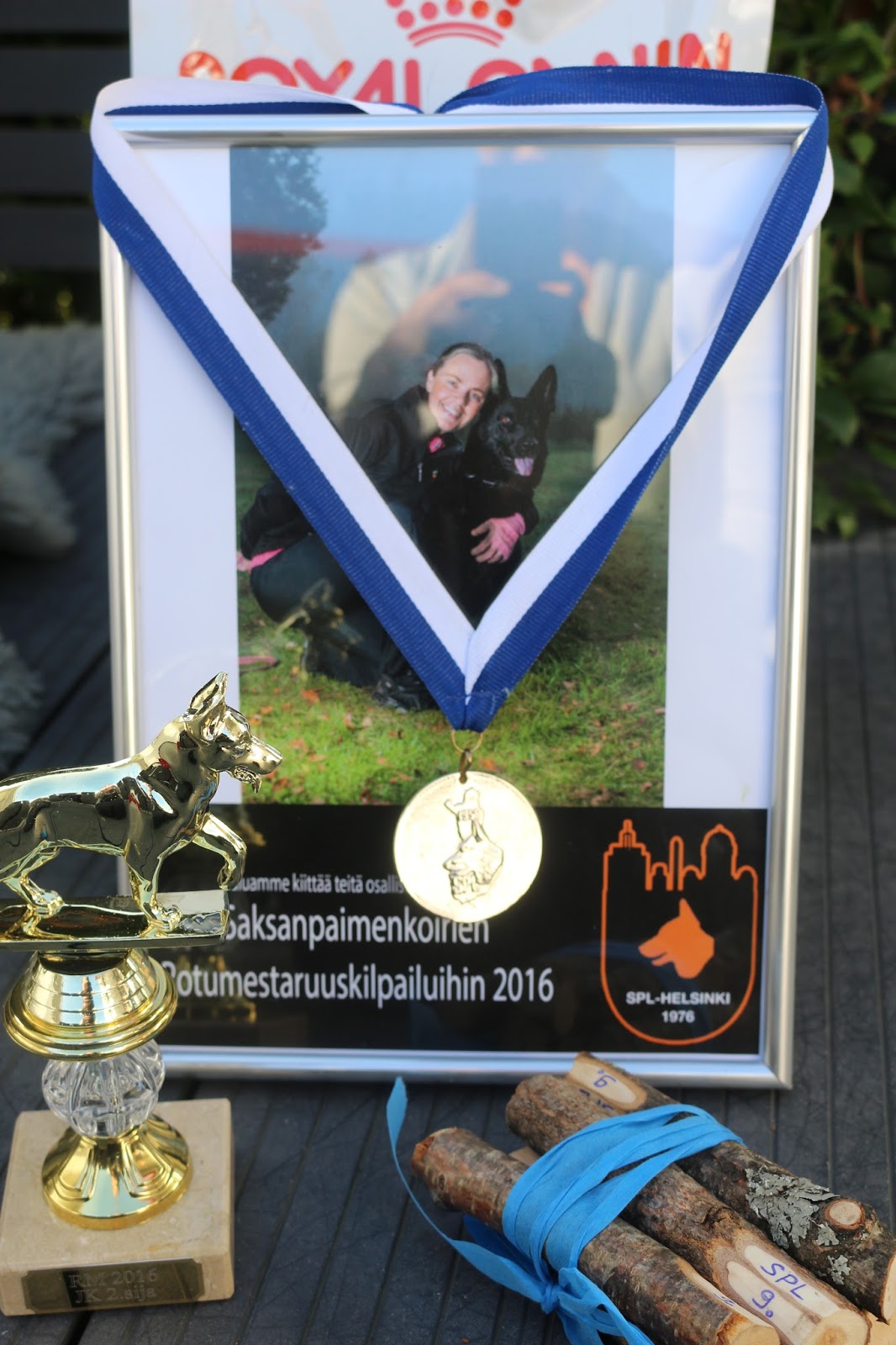 Jäljen jälkeen palasimme vielä lähtöpaikalle, jossa sain kuulla janapisteet: 39 pistettä! Piste meni siinä, kun en ollut päästänyt 15 metrin liinaa ihan loppuun asti (10 metrin kohdalla on merkki, johon stoppasin). Arvokisoissa liina pitää kuulemma päästää aina loppuun saakka vaikka se olisikin yli 10 metriä pitkä. Ihana Eeva Linnala sanoi, että seuraavaa koetta varten katkaise liina 10 metrin kohdalla. Niin teen! Saimme kisassa olleet jälkikepit itsellemme muistoksi somasti siniseen rusettiin sidottuna, aivan ihana juttu! Ajaessamme jälkipaikalta takaisin kisakeskukseen uskalsin kurkata tulospalvelua. Olimme sillä hetkellä toisena, mutta yhden kisaajan tulokset olivat vielä tulematta. Pian nekin tulivat eikä tulos muuttanut sijoitustamme.