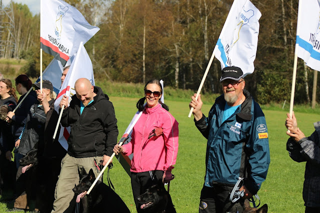 Seuraavaksi oli vuorossa aloitusmarssi. SPL Keski-Suomea edusti minun lisäkseni Järvisen Jaana, joten mehän marssittiin ja kannettiin lippua:) Marssin jälkeen oli tuomareiden puheenvuorot ja tottiksen arvonta. Toivoin tietenkin paritonta lukua, jotta pääsisimme suorittamaan ensiksi, mutta sain numeron 8 mikä tarkoittaa sitä, että joudumme aloittamaan paikkamakuulla. Alkoi hermostuttamaan, koska Tuto saattaa kerätä paikkamakuussa turhia kierroksia ja mielentila ei ole silloin paras mahdollinen. Meidän tottispari oli Sirpa Kuiri 8-vuotiaan Cepe koiransa kanssa.