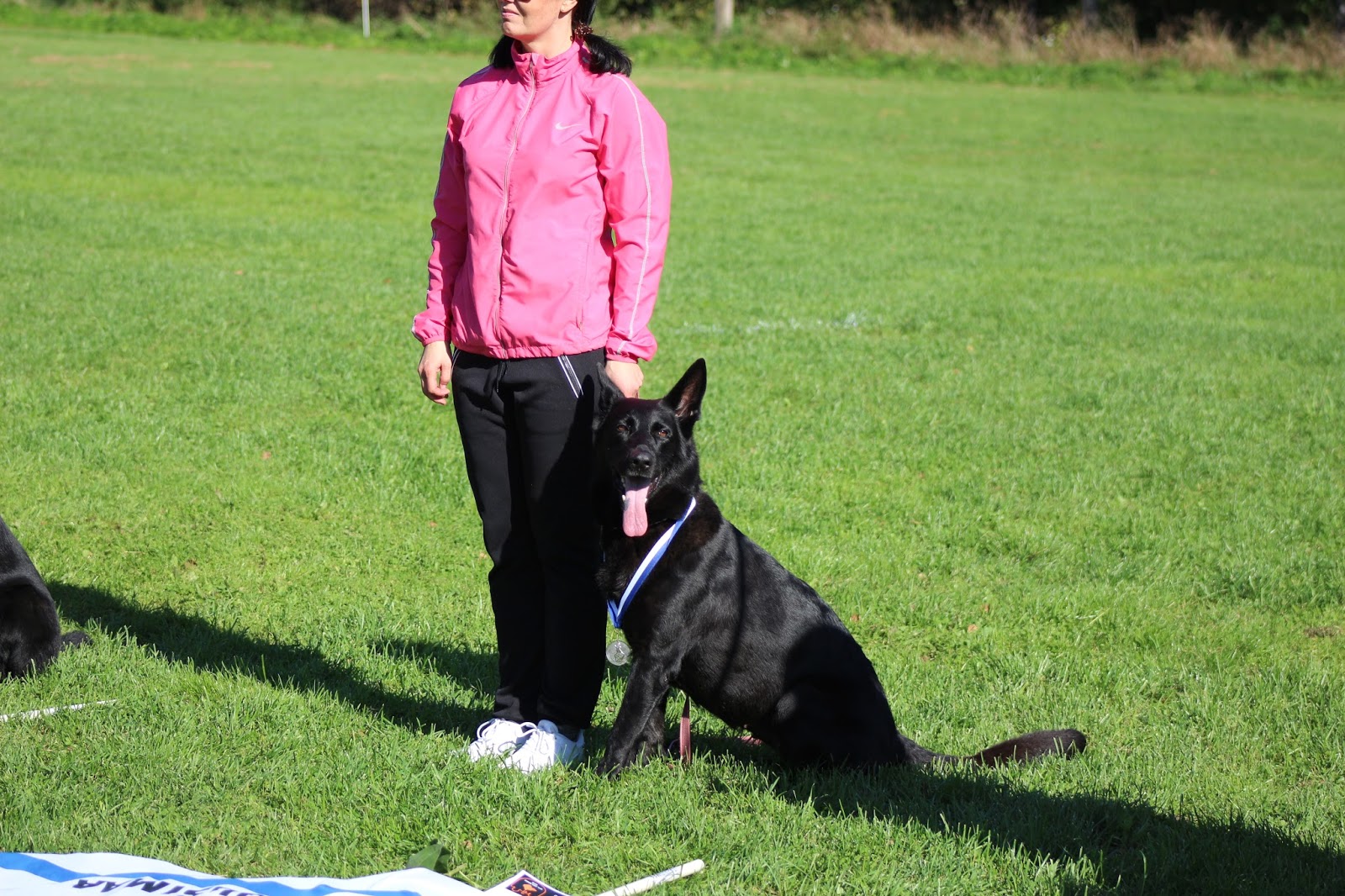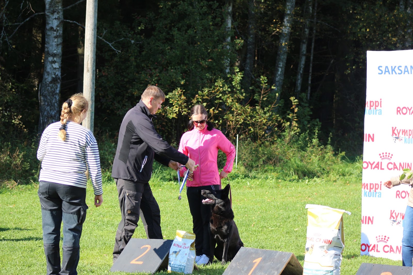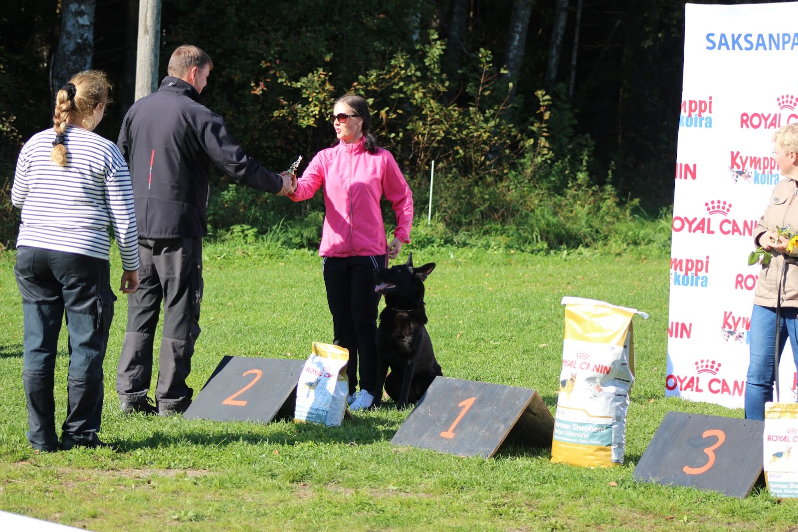 Palkintojen jakoa edelsi marssi, jonka jälkeen järjestäydyimme riviin päätuomarin puheen ja palkintojen jaon ajaksi. 38 saksanpaimenkoiraa istui metrin päässä toisistaan sulassa sovussa. Muiden kilpailijoiden kanssa ääneen ihmettelimme mustien sakemannien suurta määrää, joka paljastui vasta kun näimme rivissä kaikki osanottajat. Aurinko paistoi ja fiilis oli loistava!