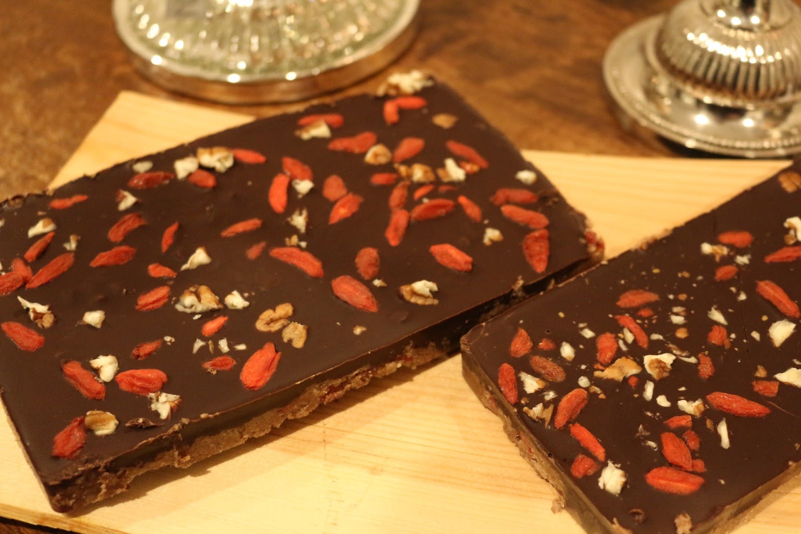 No niin, siis suklaaohje taas kyseessä! Lupaan rauhoittua jonkin ajan kuluttua ja postata muutakin kuin suklaaohjeita. Ehkä tämä joulu sekoittaa päätäni ja saa ajatukset suklaan suuntaan vähän liiankin usein. Ajattelet varmaan, ettei tuo muija tee muuta kun syö suklaata ja näinhän se vähän onkin! Jos ihminen on sitä mitä se syö, niin minä olen sitten vihersmoothie ja raakasuklaa. Tämäkin ohje on terveellinen: hyviä rasvahappoja pähkinöistä ja manteleista, vitamiineja ja hivenaineita kuivattuista supermarjoista ja raakakaakaosta, tummasta suklaasta jne. Eli taitaa kuulostaa tutulta:)