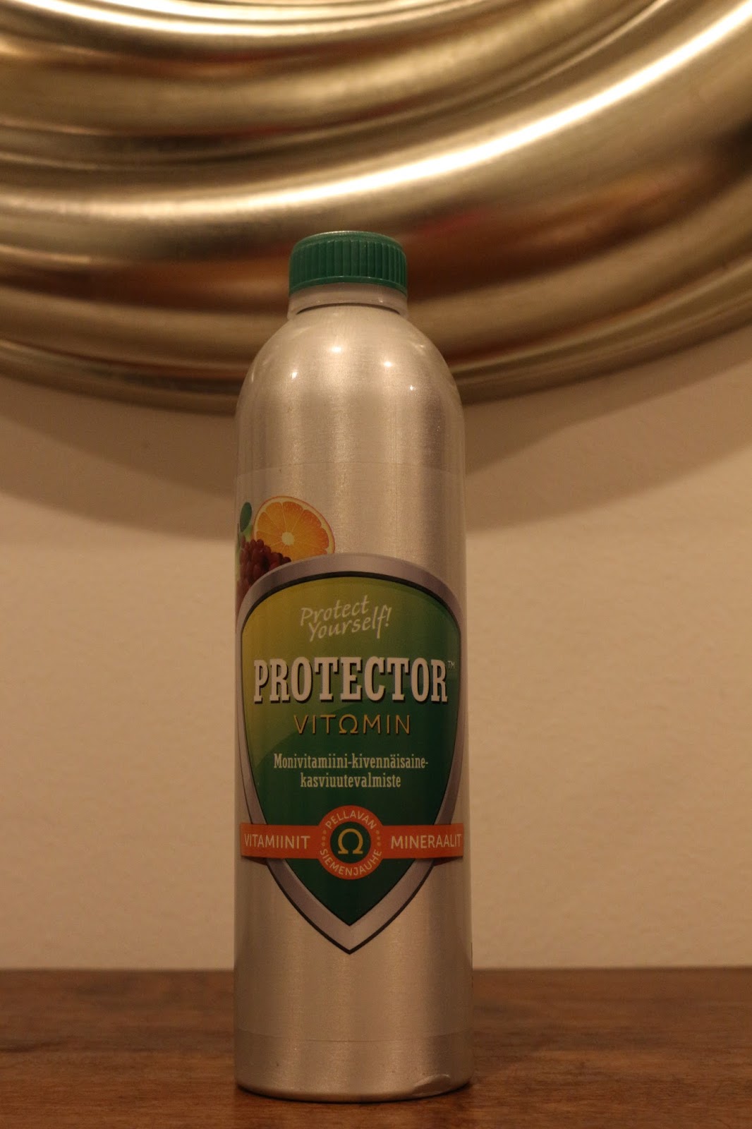 Nestemäinen monivitamiini-, kivennäis- ja kasviuutevalmiste Protector on toinen suosikkini. Sen virkistävä vaikutus tuntuu välittömästi eikä tarvitse ihmetellä kun vilkaisee tuoteselostetta. Valmiste sisältää mm. marjojen ja hedelmien antioksidantteja, vitamiineja ja karotenoideja. Ja koska tuote on nestemäisessä muodossa, se myös imeytyy hyvin. Ei maistu pahalta:)