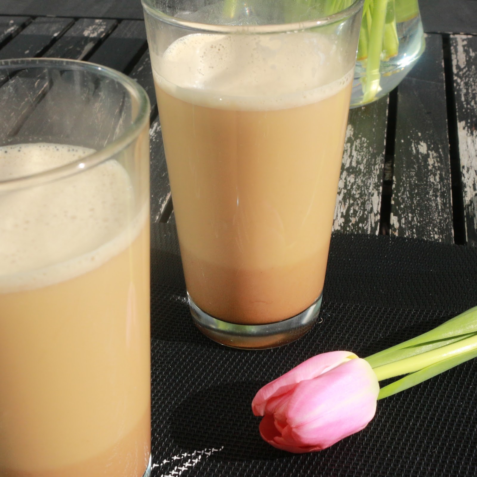 että laitan tuplaespresson sekaan hieman lämmitettyä kasvimaitoa ja sinne sitten iso voi pala