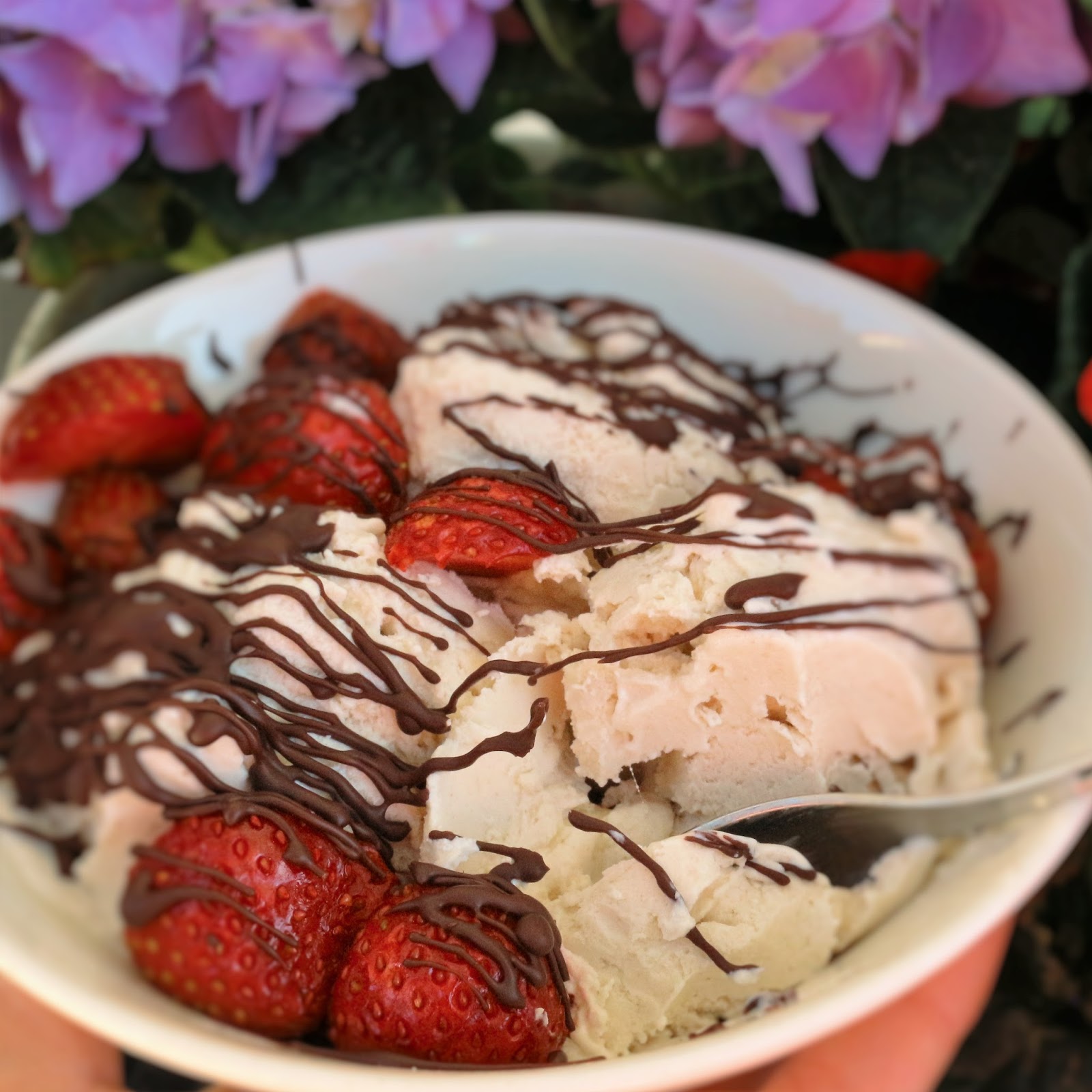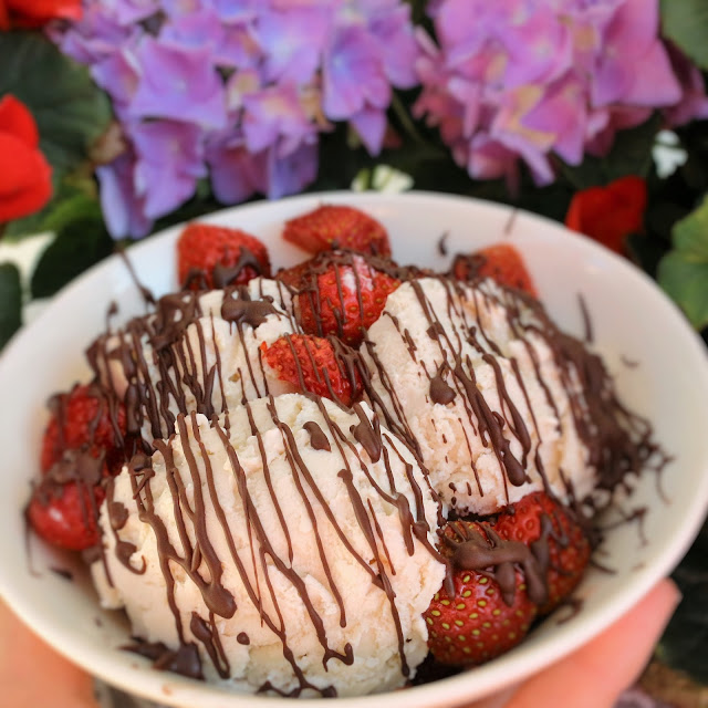 Vihdoinkin tuli lämpö- tai no onhan se tullut pari kertaa aiemminkin tänä kesänä. Molemmilla kerroilla meillä on ollut jälkikisa Tuton kanssa, joten hyvin on jäänyt mieleen kun molemmat ollaan oltu ihan läkähtyneitä. Ollaan siivoiltu ja uudelleen järjestelty meidän terassia ja parveketta Karin kanssa. Painepesuri on heilunut ja sohvaryhmiä kanneskeltu kerroksesta toiseen. Nyt kun tuli valmista ja terassit hohtaa puhtauttaan, niin tein oikein pitkän hotjoogan auringoinpaisteessa. Rakastan joogata kuumassa- hiki virtaa ja kuonat poistuvat tehokkaasti. Ja sitten kun olin joogannut, alkoi tekemään mieli jäätelöä. Mutta ei sokeria. Joten halusin kehitellä ohjeen, jossa ei ole lainkaan sokeria ja joka näin ollen sopisi syötäväksi tuoreiden mansikoiden ja sulatetun raakasuklaan kanssa.