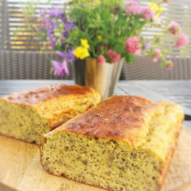 Mulla on alkanut nyt viiden viikon loma! Sen kunniaksi tehtiin Tuton kanssa kolmen lajin treenit ja kerättiin pihasta luonnonkukkakimppu. Kun on laiska puutarhuri, niin ei tarvitse lainkaan lähteä keräämään luonnonkukkia niityiltä vaan niitä löytyy ihan nurmikon reunuksilta:) Halusin kokeilla taasen vähähiilarista vuokaleipää, koska se on niin älyttömän helppo- ja nopeatekoista. Sekoitat vaan aineet kulhossa keskenään, kaadat vuokaan ja paistat. Tähän leipään halusin auringonkukansiemeniä suutuntuman takia. Leivässä on erittäin hyvä rasvahappokoostumus-kiitos chiajauhon ja auringonkukansiementen. Ja kuitujakin on ihan mukavasti.