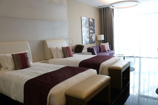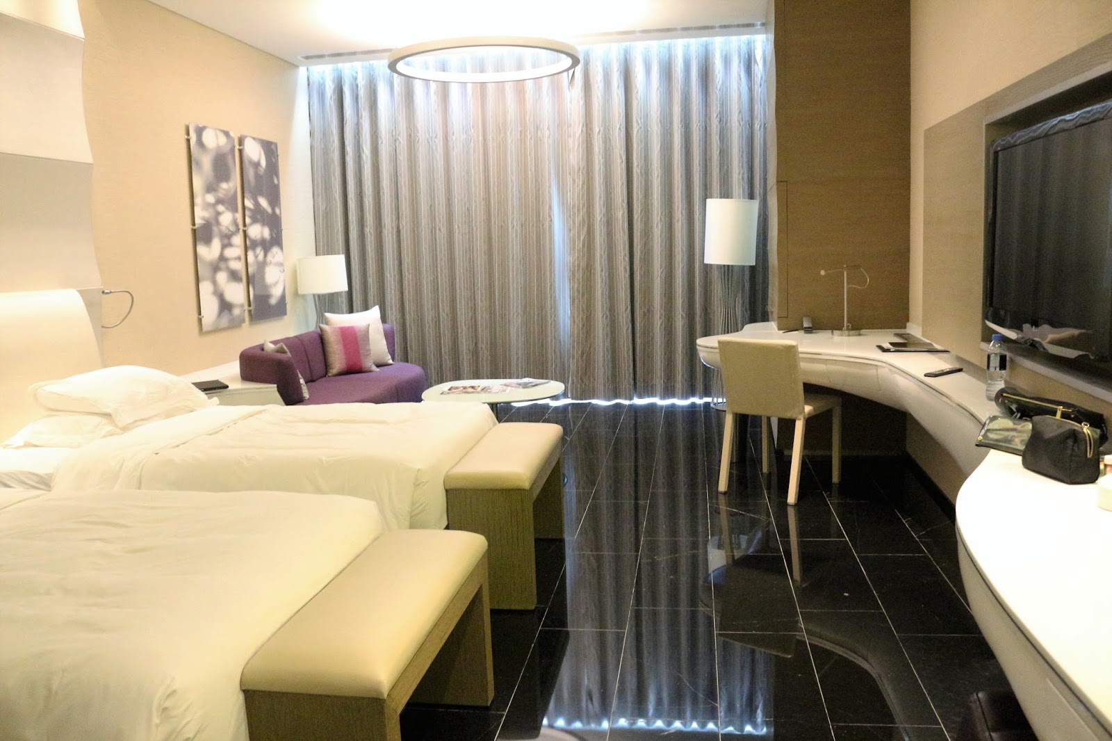 Hotellihuone on tosi siisti ja tilava. Tämä huone on varmaan ollut tämän hotellin halvimmasta päästä, mutta silti on todella hyvä. Takaseinä on kokonaan lasia, josta pääsee lasitetulle parvekkeelle. Kylppäri jakautuu kolmeen osaan: erillinen wc, suihkutila ja kylpuhuone, jossa on iso amme. Valojen kanssa on ollut kova opettelu, koska huoneessa on ainakin 8 elektronista valokatkaisijaa. Pitkään meni kunnes löysimme verhojen katkaisijan. Yritin monta kertaa siirtää isoja verhoja sivuun, kunnes tajusimme, että nekin on katkaisijan takana.