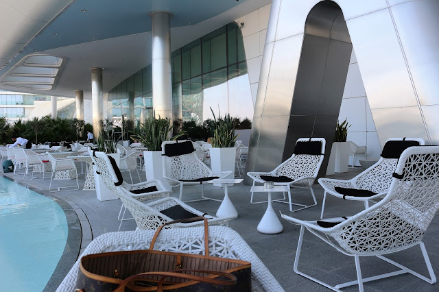 Hotellin allasalueet ovat katolla ja ne ovat tilavat ja hienot. Allasalueelta näkee suoraan formula radalle. Alueella on isoja pehmoisia sohvia ja perinteisiä aurinkotuoleja. Ja säähän Emiraateissa on aina loistava. Koskaan ei ole satanut, välillä onneksi hieman tulee. Kovalla tuulella hiekka saattaa pölytä aavikolta.