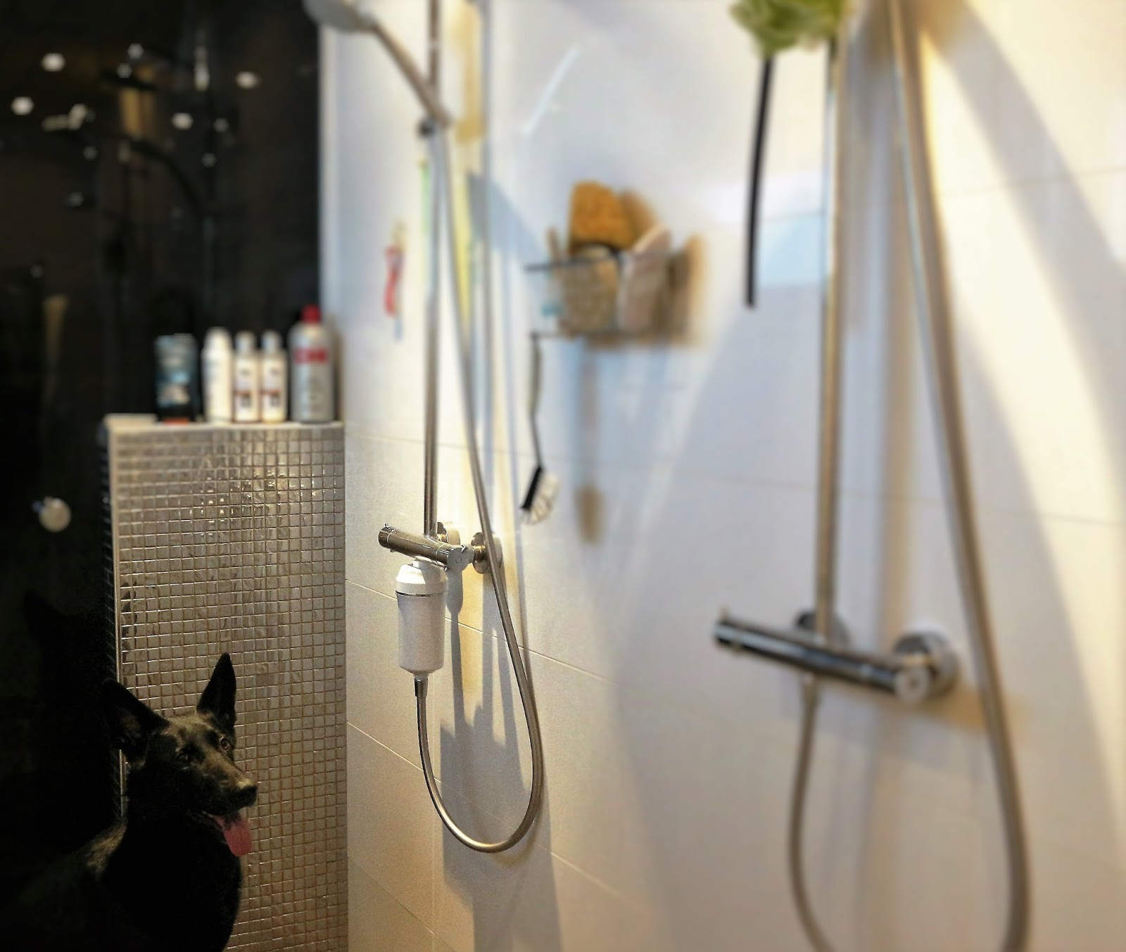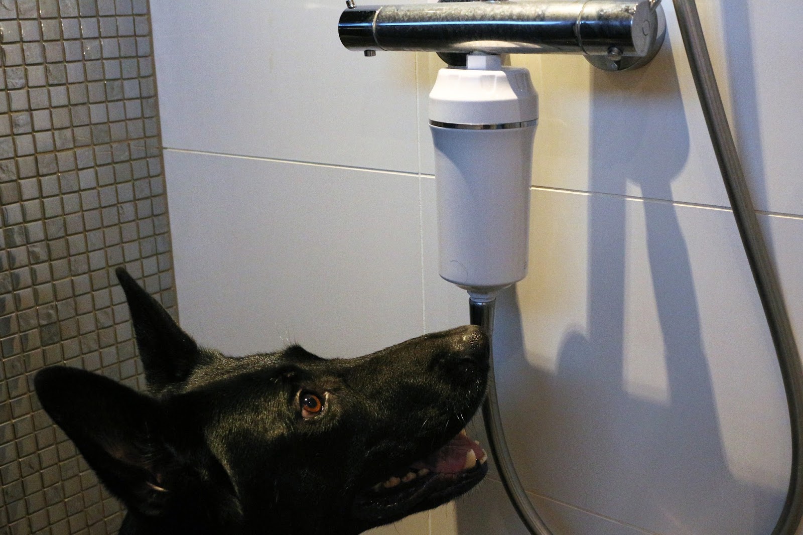 Saksanpaimenkoiramme Tuto juo nykyään myös suodatettua vettä ja kun Neito pääsee suihkuun, niin turkki pestään suodatetulla vedellä. Alla olevassa kuvassa Tuto näyttää lukijoille missä suihkusuodatin sijaitsee ja Neito osallistui tietenkin tapansa mukaan molempien suodattimien asennuksiin hyvinkin keskeisellä roolilla?? Ihan rehellisesti sanottuna, Tuto osallistui hanasuodattimen asennukseen sillä intensiteetillä, että jouduimme antamaan liiallisesta innostuksesta palautetta, josta seurasi syvä loukkaantuminen ja mökötys syvien narttumaisten pilaatte-mun-elämän- huokailujen saattelemana. Suihkusuodattimen asennus taasen sujui mallikkaasti; saksanpainajainen muisti roolinsa eikä tunkenut itseään niin iholle, että minäkin mahduin asentamaan. Koiralle joutuu joskus kertomaan, että hän on apulainen ja minä olen työnjohtaja eikä toistepäin?