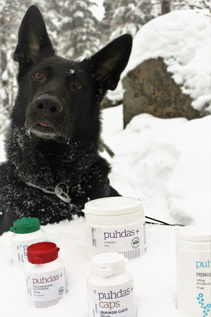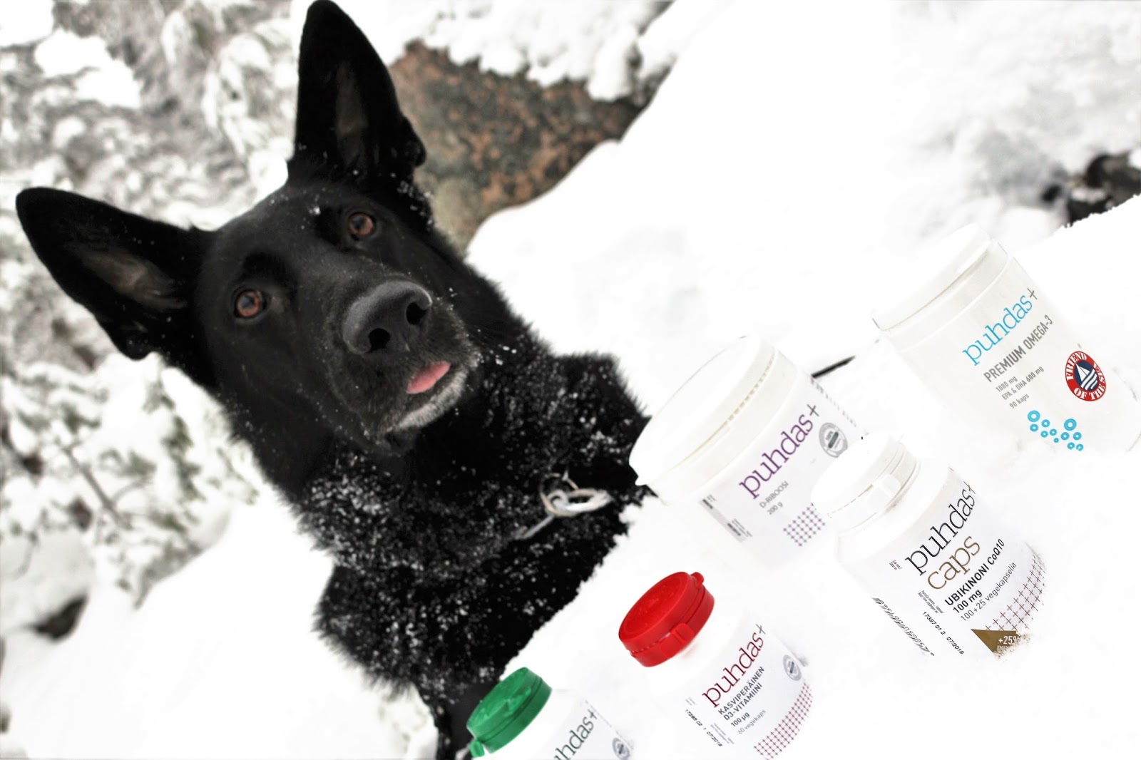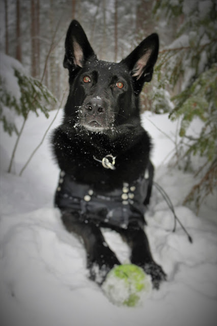 Oltiin Mamman kaa metsässä lenkillä ja Mamma otti Meikästä ja jostain valkoisista purkeista kuvia. Ne purkit Mamma yritti laittaa hienosti kiven päälle ja Meikä seisoi takajalkojen varassa kiveä vasten purkkien takana. Meikä jaksoi kyllä olla paikallaan hiiskumatta pitkiäkin aikoja, koska tykkään olla kuvattavana. Se on ihan parasta ruoan varastelun ja treenaamisen jälkeen. Kuvatessa Mamma yleensä kehuu Meikää ihan tolkuttomasti tyyliin, että ”Ai kun olet hieno tyttö” tai ”Kyllä sä Tuto olet olet maailman kaunein koira”! Tänään Mamma vaan sano koko ajan, että ”Tuto, laita se kieli suuhun”! Sitä Meikä ei oikein ymmärtänyt, että mitähän se Mamma mahtaa sillä tarkoittaa. Se ei nimittäin ole mikään tuttu käsky. Loppujen lopuksi Mamma antoi vapaa käskyn, heitti pallon ja kaatui itse lumeen selälleen ja nauroi ihan suoraa huutoa. Meikä hyppäsi Mamman päälle ja sitten alkoi hurjat leikit. Purkitkin lensi pitkin lumihankia…