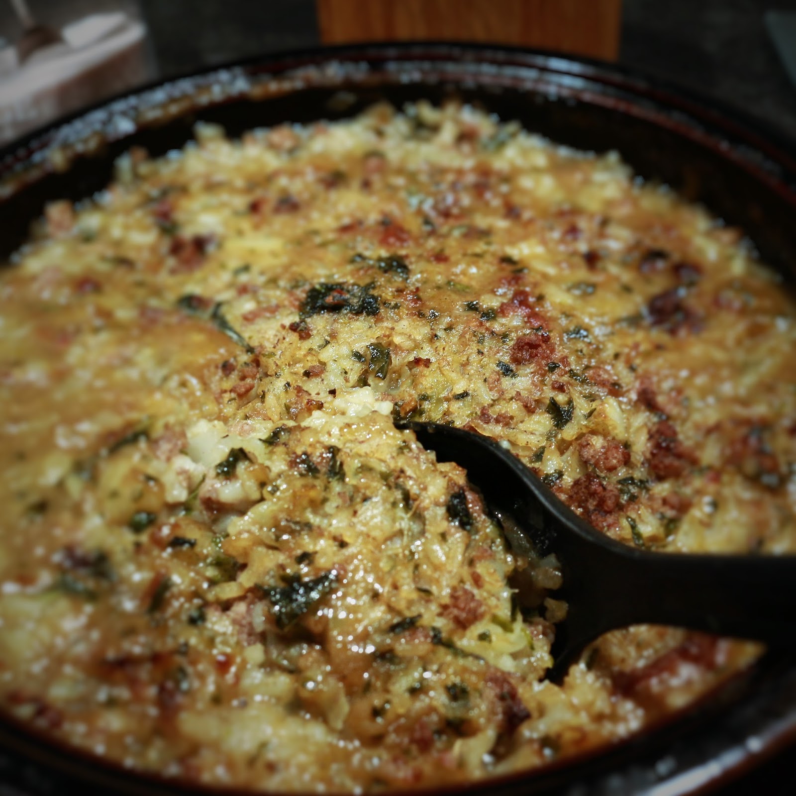 Suikaloi kaali ja hienonna sipuli. Laita riisi kiehumaan lihaliemeen ja lisää kaali ja sipulit. Keitä hiljalleen niin kauan kun kaali on pehmentynyt eli noin vartin verran. Paista jauheliha ja lisää paistamisen lopussa pakastettu lehtikaali, joka hienonnetaan kädessä puristamalla pieneksi muruksi. Lisää jauheliha ja lehtikaali kaali-riisi-sipuliseokseen. Mikäli seoksesta tulee liian paksua, lisää hieman vettä. Lisää mausteet ja hauduta vielä hetki. Kaada seos voideltuun uunivuokaan ja paista 175 asteessa uunin keskilämmöllä noin tunti.