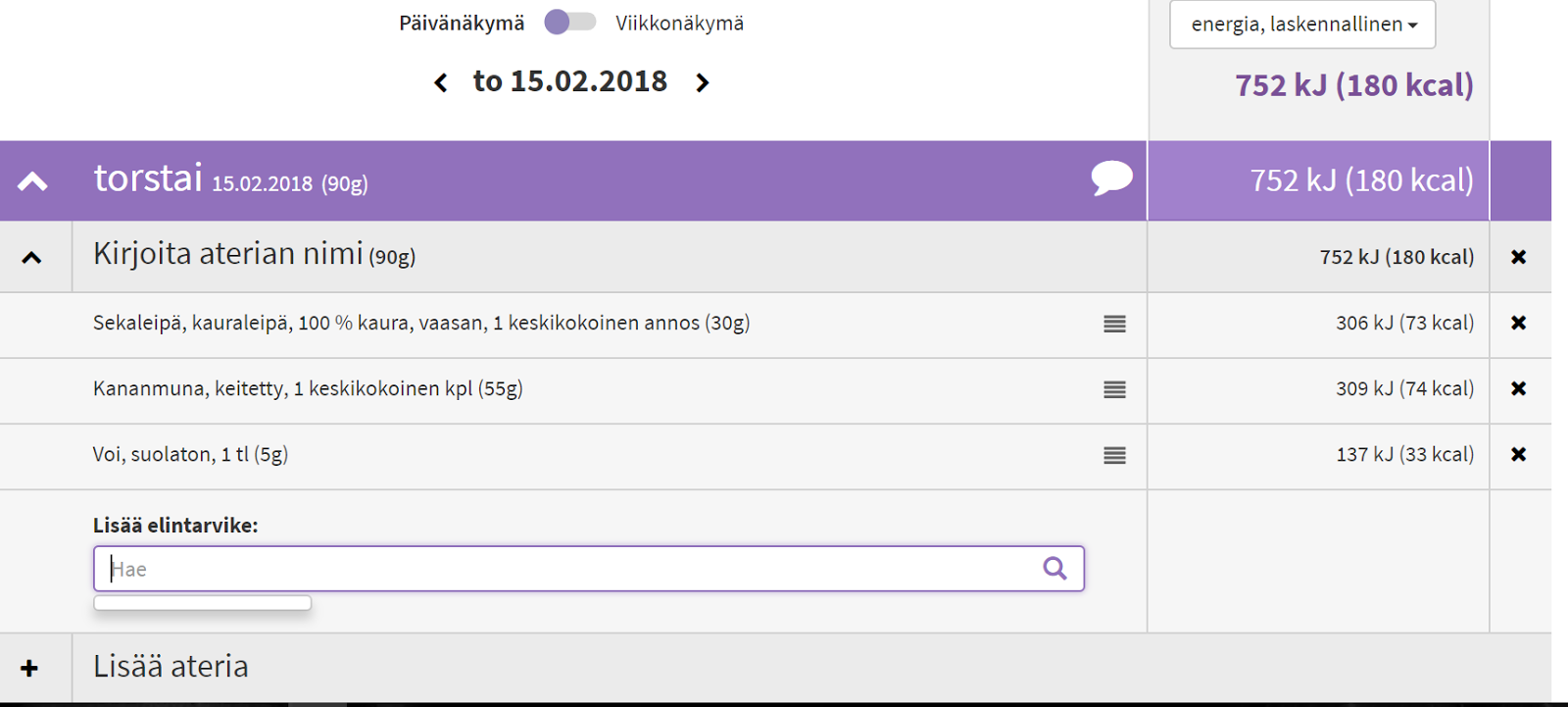 Lisää ateria kohdasta voit lisätä taulukkoon kaikki päivän ateriat.