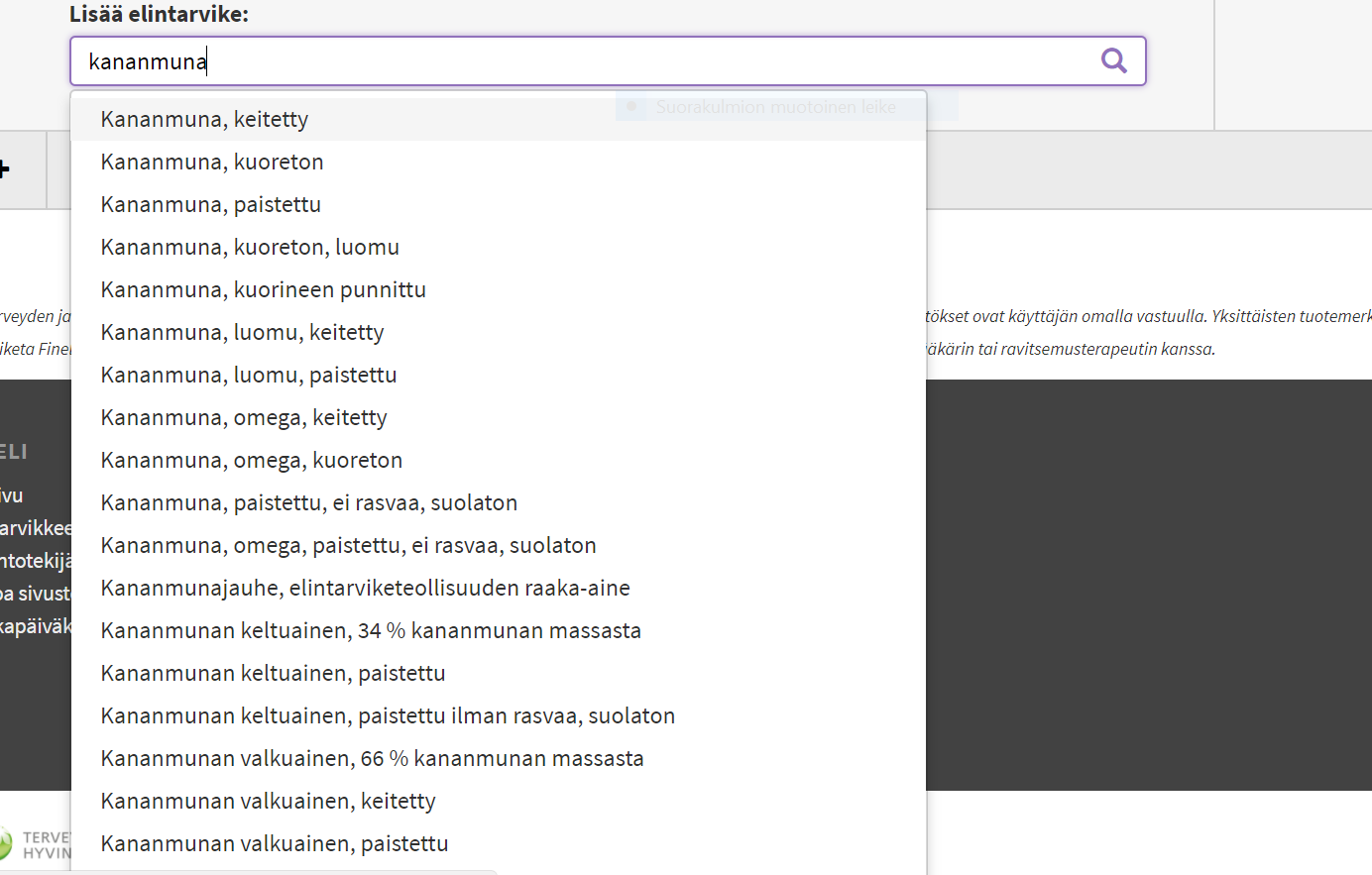 Kirjoita ”lisää elintarvike” kohtaan elintarvikkeen nimi mahdollisimman täsmällisesti. Esimerkiksi kananmuna, ei muna.