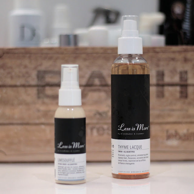 ​Less is More on ensimmäinen täysin luonnollinen ammattilaiskäyttöön kehitelty hiustenhoito- ja muotoilutuotesarja. Tuotteet koostuvat yksinomaan luonnollisista ja uusiutuvista raaka-aineista ja ne hankitaan sertifioiduilta luomuviljelijöiltä aina kun mahdollista. Olen testannut myös Less is Moren Cajeput Pure Balance shampoota ja hoitoainetta ja nyt sain testiin ensimmäisen luonnonmukaisen ponnekaasuttoman Thyme Lacquer hiuslakan ja Limesouffle hiusvahan. Hiuslakkaa ja vahaa en ole koskaan aiemmin luomuna testannutkaan.