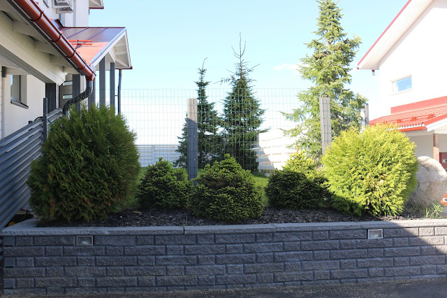 Sisäpihalla oli valmiiksi tien puolella puuaita, joten sille tontin sivulle ei tarvinnut tehdä mitään. Sen sijaan tontin toinen raja aidoitettiin 150 cm korkealla verkkoaidalla, jotka on kiinnitetty puutolppiin. Rajalla oli jo valmiiksi korkea kiviaita ja naapurin tekemä korkea aita, mutta periaatteessa koirat olisivat halutessaan pystyneet kiivetä kiviaidan päälle ja juosta sieltä tielle. Eivät sitä koskaan ole edes meinanneet tehdä, mutta halusimme kuitenkin varmuuden vuoksi aidata tämänkin vielä uudestaan. Verkkoaitaan päädyimme kiviaidan vuoksi; halusimme, että se näkyy verkkoaidan läpi koska on kivan näköinen.