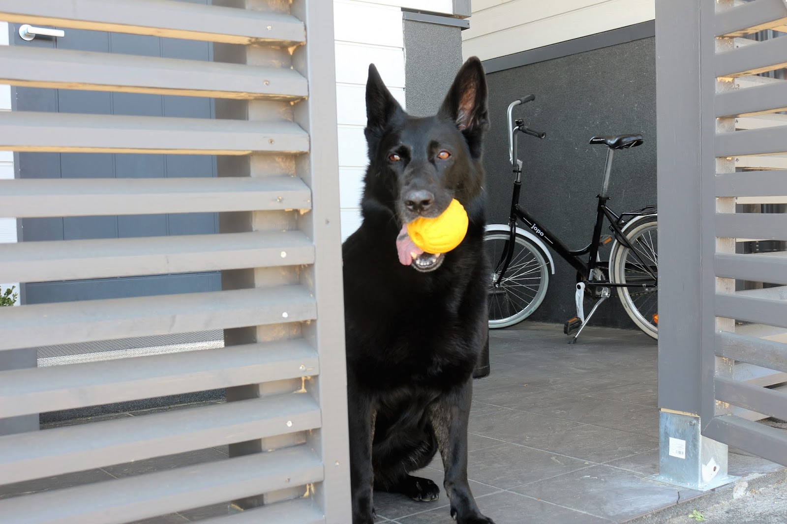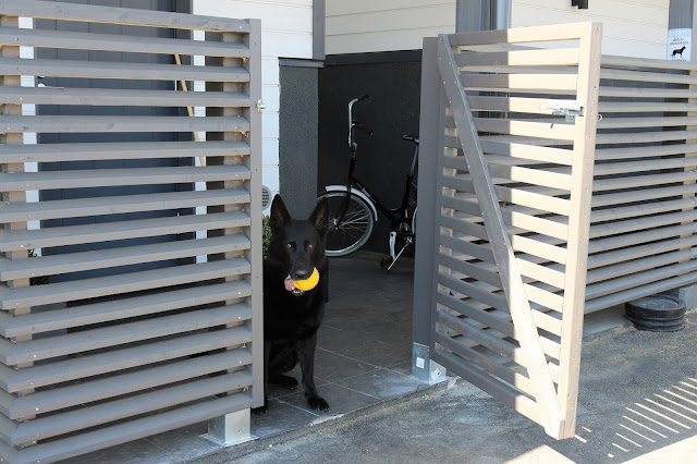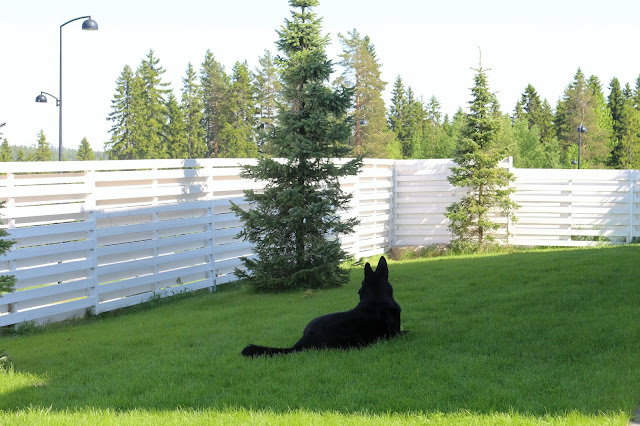 Ollaan oltu älyttömän tyytyväisiä tähän projektiin: stressitaso on laskenut huomattavasti kun ei tarvitse miettiä ovatko ovet auki ja nyt koira voi kulkea meidän mukana pihalla vapaana. Toki kulki se ennenkin, mutta nyt on huolettomampaa. Saksanpaimenkoira on ihmisen koira ja haluaa olla aina siellä missä ihmiset ovat, joten eipä Tuto ole pihalla yksin juuri lainkaan. Jos onkin, niin menee sellaiseen paikkaan, että näkee ja kuulee mitä sisällä tapahtuu ja hakee minua koko ajan kanssaan pihalle. Yhdessä ollaan ja mennään kuten aikaisemminkin.