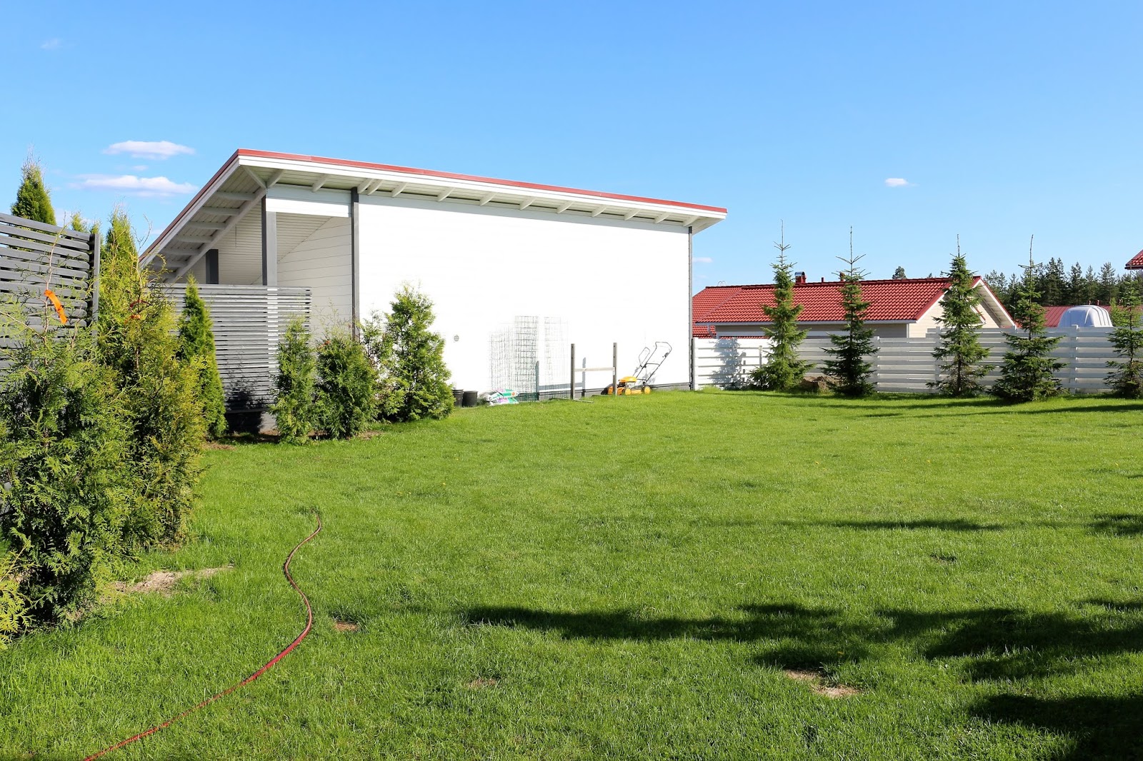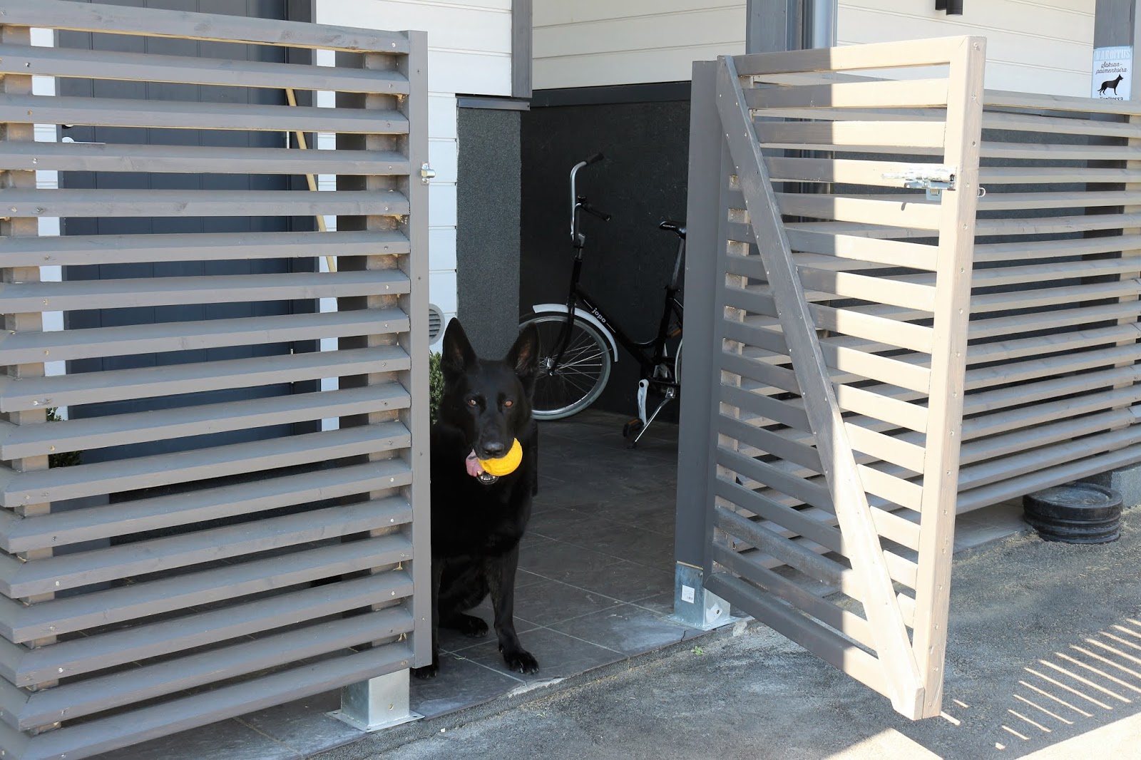 Takapihan puuaitaa korotettiin noin 40 senttiä ja sen korkeus on nyt 140-160 senttiä. Saatiin lisää näkösuojaa, mikä ei haittaa ollenkaan. Toki tiedän, että saksanpaimenkoira halutessaan voi hypätä vaikka kuinka korkean aidan yli, mutta ainakaan meillä ei sellaisia haluja ole näyttänyt olevan. Kertaakaan koira ei ole edes hypännyt mitään aitaa vasten. Sen sijaan Tuto on vähentänyt haukkumista tosi paljon kun on saanut olla tontilla vapaana. Aiemmin koira on saanut oleskella meidän isolla aidatulla terassilla, jossa toki nytkin on paljon silloin kun ihmiset ovat sisällä.
