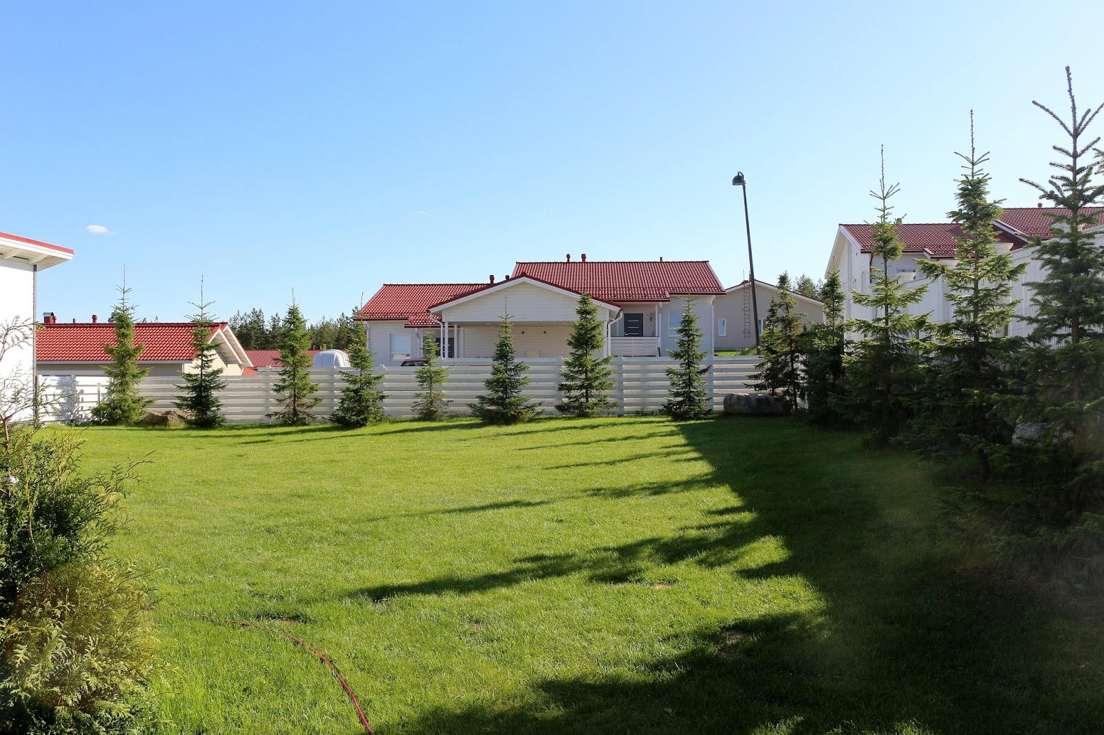 Pitkään mietittiin laitetaanko etupihalle valkoinen puuaita, mutta päädyimme 150 senttiä korkeaan vihreään verkkoaitaan, jotta näkymä etupihalle säilyy katkeamattomana. Verkko on kiinnetetty muutamaan tukevaan tolppaan.