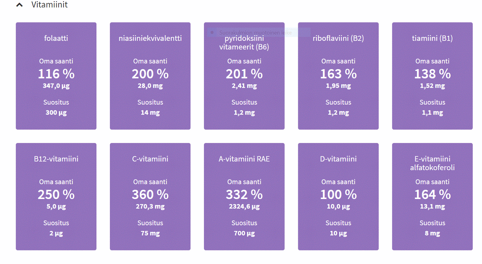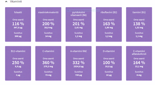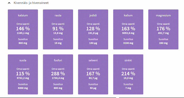 Seuraavaksi selaa sivua alaspäin ja sinulle tulee näkyviin kuidun määrä, kivennäis- ja hivenaineet ja lopuksi vitamiinit. Suurin luku on oma saantisi prosenteissa ja alla suositus. Näet helposti eri laatikoista mikä on oma tilanteesi?