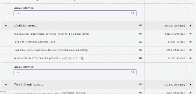 Mielestäni laskuri sopii sellaiselle ihmiselle, joka syö suurinpiirtein ”normaalia” ruokaa. Mikäli ruokavalio koostuu suurelta määrin esimerkiksi superfoodeista, niin niitä tuskin löytää laskurista. Eli ymmärtääkseni laskuri on tehty kansallisten ravitsemussuositusten pohjalta ja tämä tietenkin voi närästää joitakin lukijoita. Voin kuitenkin kertoa, etten ole ryhtynyt THL:n kätyriksi enkä ole mukana elintarviketeollisuuden salaliitoissa vaikka tästä laskurista nyt kirjoitankin. Kirjoitan siitä sen vuoksi, että mielestäni se on erittäin käyttökelpoinen ja informatiivinen ilmaiseksi työkaluksi. Toki parempiakin laskureita on varmasti olemassa, jotka huomioivat paremmin yksilöliset asiat, mutta minä en ole ainakaan vielä tietoinen muista laskureista. Kirjoitellaan niistä sitten myöhemmin mikäli sellaisia löytyy.