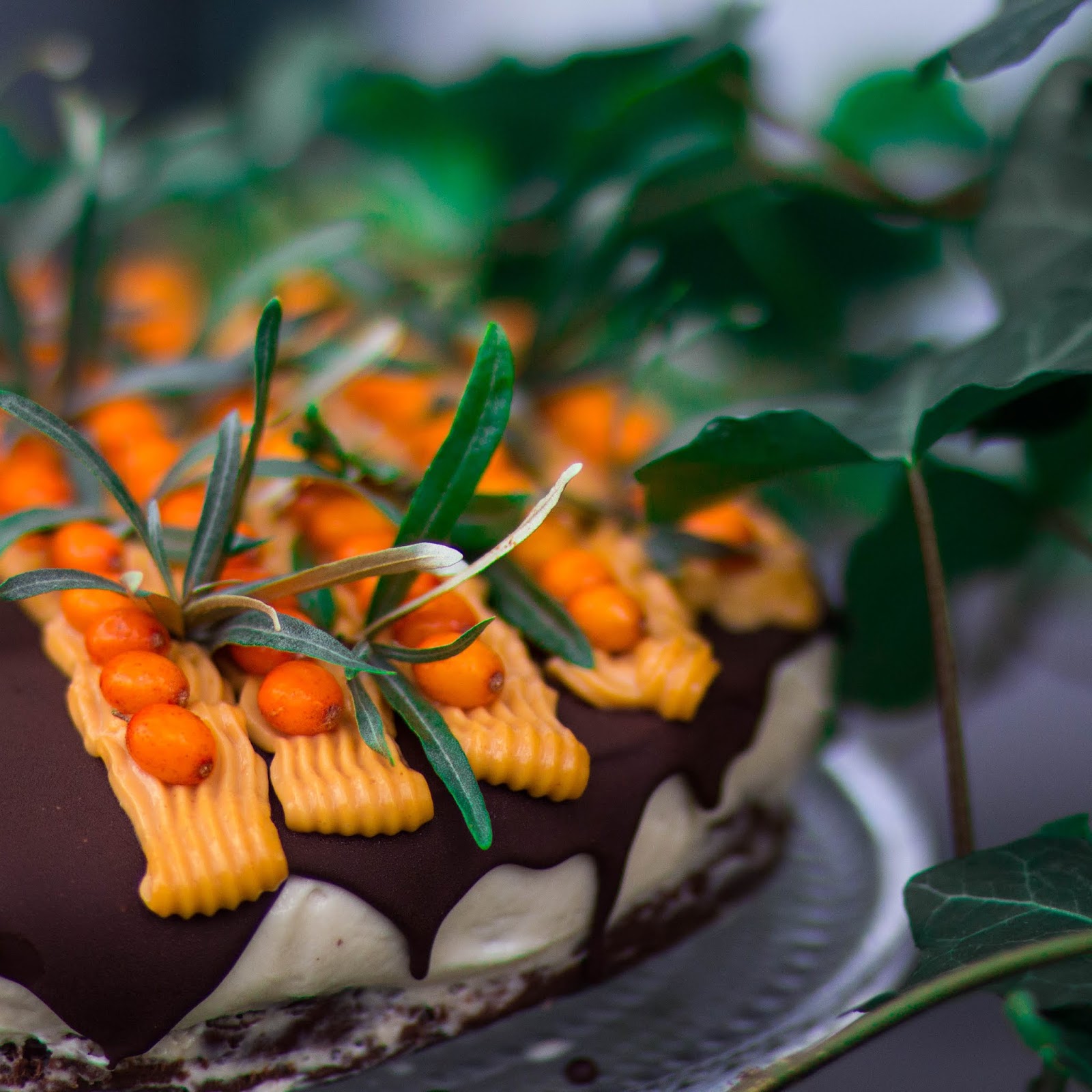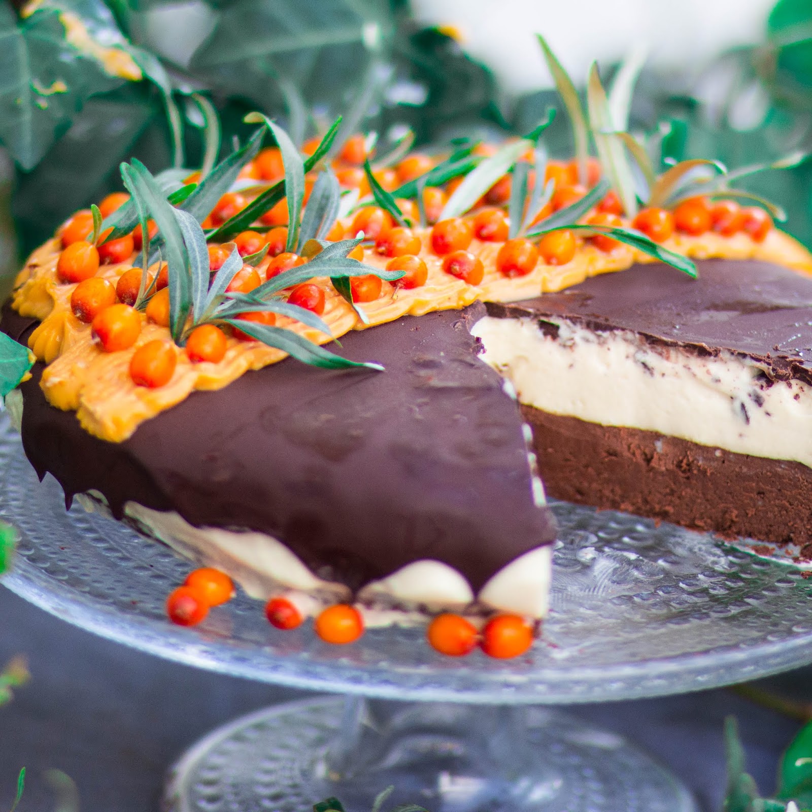 Koristelin tällä kertaa kakun cashewtahnatyrni kuorrutteella ja tyrnimarjoilla. Voit jättää kuorrutteen tekemättä jos haluat sillä suklaakuorrute riittää vallan hyvin. Parhaimmillaan kakku on seuraavana päivänä.