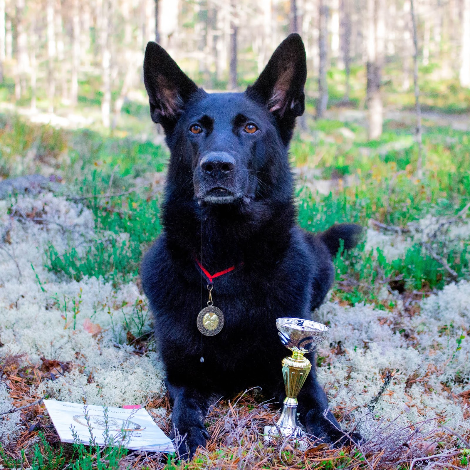Meikä on kuntoutunut niin hyvin, että pääsin viime lauantaina piirinmestaruuskisoihin, laji oli metsäjälki. Meikä löyti kaikki kepit? Tottis meni siihen nähen hyvin, että ei olla sitä kolmeen kuukauteen reenattu. Paitsi paikkamakuu: siinä Meikä esitti ihan oman koreografian: liikuskelin vähä ja tuijotin tuomaria uhkaavasti??? Meikä sai pronssia, mikä oli 7:n koiran kokeessa ihan kelpo suoritus.