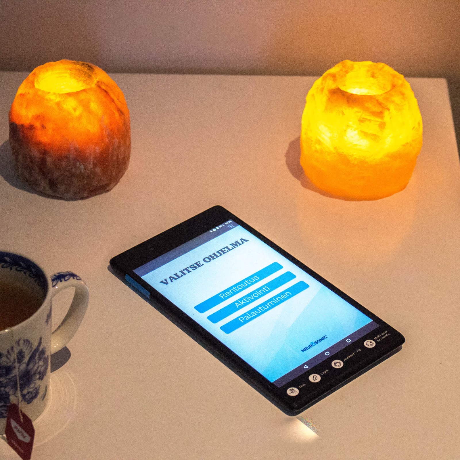 Iltani kohokohta on lepohetki Neurosonicilla. Pimennän huoneen, laitan kynttilöitä palamaan ja asettaudun patjalla makaamaan lämpimän viltin alle. Asetan kuulokkeet korvilleni ja hoidon ajan kuuntelen yleensä Youtubesta ohjattua yoganidra harjoitusta ja poikkeuksetta nukahdan hetkeksi hoidon aikana. Hoidon jälkeen olo on levollisen virkistynyt, ei kuitenkaan ylivirittynyt. Ennen nukkumaan menoa teen vielä muutaman hitaan aurinkotervehdyksen ja pari kokonaisvaltaista venyttävää asanaa, levitän iholleni magneisiumöljyä ja olen valmis nukahtamaan. Neurosonic on parantanut elämäni laatua, vähentänyt stressiä, parantanut untani ja vilkastuttanut aineenvaihduntaani vaikkakin vähän hakkasinkin päätäni seinään opetellessani laitteen käyttöä.