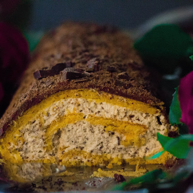 Laita liivatteet likoamaan kylmään veteen vähintään 5 minuutiksi. Rouhi tumma suklaa pieneksi muruksi. Vispaa kerma vaahdoksi ja sekoita kerman joukkoon tuorejuusto, vanilja, rouhittu suklaa ja blendattu sokeri. Sekoita tasaiseksi. Keitä 2 tl vettä kiehuvaksi ja lisää liivatteet kiehuvan veden sekaan (purista ensin ylimääräinen vesi pois liivatteesta). Sekoita liivateseos tasaiseksi ja lisää varovasti kermaseokseen koko ajan sekoittaen. Levitä täyte jäähtyneen pohjan päälle ja kääri varovasti leivinpaperilla auttaen rullaksi. Laita torttu jääkaappiin siksi aikaa kun valmistat kuorrutteen.