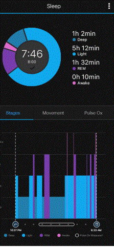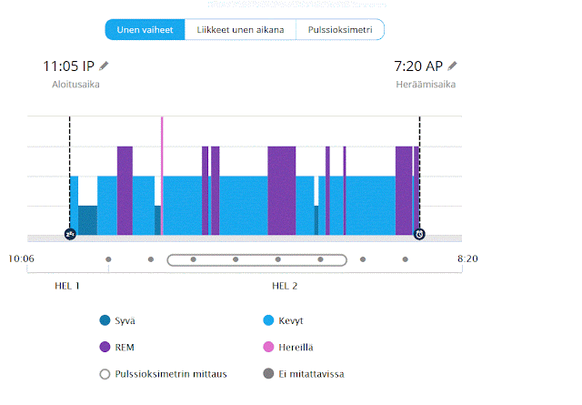 Unen vaiheita seuraan myös päivittäin eli aina aamulla katson miten edellinen yö on rannekkeen mukaan mennyt. Mielestäni ranneke antaa realistisemman kuvan yöunesta kuin Oura ja laitteen tiedot korreloivat hyvin myös omien tuntemusteni kanssa. Ouran ongelma on se, että se tulkitsee hyvin herkästi valveillaolon paikoillaan kevyeksi uneksi. Ranneke näyttää myös yön aikaiset liikkeet ja happisaturaation. Kaikista tarkin unenseurantalaite on tietenkin aivosähkökäyrä, mutta yllättävän tarkka tämäkin on.
