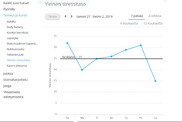 Ylläolevasta kännykkänäkymästä näet eilisen (lauantai eli vapaapäivä) päivän stressitilanteen ja stressin kokonaismäärän, joka oli lukuna ilmaistuna 28. Kyseessä oli rento päivä, joka sisälsi paljon lepoa (lukemista, tunnin meditaation jne.) eli stressin määrä oli alhainen ja laite ilmoittikin, että päivän lepoaika riitti tasapainoittamaan stressireaktiot. On tärkeää ymmärtää, että rento päiväkin sisältää aina stressireaktioita ja se on ihan normaalia. Sen sijaan jos stressitaso nousee liian korkeaksi ja jatkuu liian pitkään, se alkaa kuluttaa kehon resursseja ja voi johtaa uupumiseen. Mikäli minulla on ollut hyvin stressaava päivä, pyrin ottamaan seuraavan päivän iisimmin eli en välttämättä harrasta esimerkiksi hyvin raskasta sykettä nostavaa liikuntaa juuri sinä päivänä. Tähän mennessä stressaavin päivä on ollut sellainen, että työpäivän jälkeen perjantai-iltana menimme ystäväpariskunnan kanssa syömään, join pari lasia viiniä ja menin vasta yhdeltä nukkumaan. Stressitaso oli melko korkealla, voin vaan kuvitella miten korkealla se olisi jos juhlisi oikein kunnolla aamuyöhön korkkarit katossa?