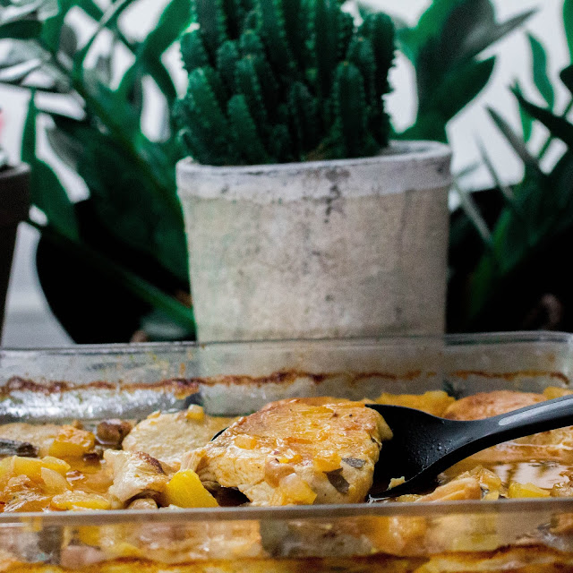 Paistoajasta sen verran, että olen tehnyt tätä ruokaa kahdella tavalla eli paistanut 175:ssä asteessa 45 minuttia, kuten ohjeessa sanotaan tai 150 asteessa jopa 1,5 tuntia. Paistoaika riippuu vähän siitä, miten paljon broileria paistaa paistinpannulla ennen uuniin laittamista ja ehdottomasti broilerinpalojen paksuudesta. Itse paistoin broitsua sen verran, että se ruskistui molemmilta puolilta hieman ja leikkeet olivat melko ohuita. Nuo mainitsemani mausteet eivät ole mitenkään kiveen hakattuja, joten voit tätäkin ohjetta modata omannäköiseksesi myös maustamisen osalta. Mielestäni nuo kokonaiset currynlehdet tuovat kanaruokiin ihan loistavan maun ja itse ostan niitä etnisestä kaupasta. Minulla on tapana hieman puristella lehtiä pienimmäksi käsissäni ja heittää ne sitten pannulle rasvan sekaan.
