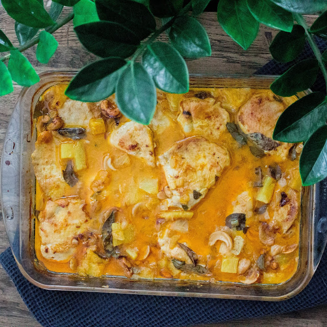 Viikonlopun ruokavinkki on tämä loistavan makuinen kookoskana ananaksella! Tämä on ihan ehdottomasti paras suomalainen kanaruoan ohje, mitä olen koskaan onnistunut kokkaamaan! Painotan sitä, että paras suomalainen ohje, sillä kuten varmaan muistatte, rakastan intialaista ruokaa ja blogistakin löytyy aivan loistava intialaisia kanaruokien ohjeita. Mielestäni tämäkin ohje on erittäin helppo valmistaa ja kaiken lisäksi mukavakin. Eniten menee aikaa tuoreen ananaksen pilkkomiseen, mutta mielestäni se vaiva kannattaa nähdä, koska tuore ananas maistuu ihan erilaiselta kuin purkkiananas. Suolatut cashewpähkinät tuovat tähän ruokaan hauskan makuvivahteen ja loistavan maun salaisuutena on se, että mausteita kuullotetaan heti alussa rasvan seassa!