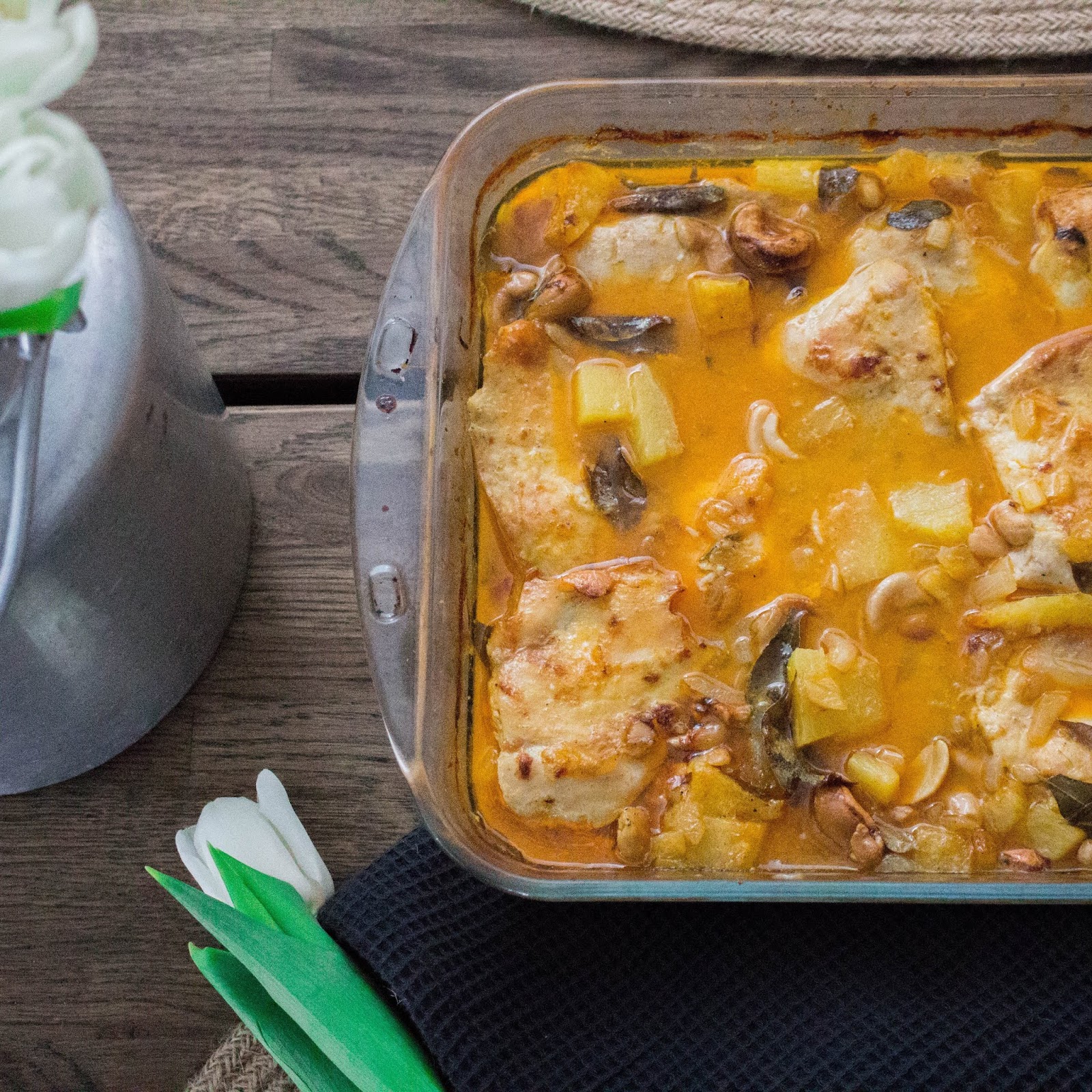 Viikonlopun ruokavinkki on tämä loistavan makuinen kookoskana ananaksella! Tämä on ihan ehdottomasti paras suomalainen kanaruoan ohje, mitä olen koskaan onnistunut kokkaamaan! Painotan sitä, että paras suomalainen ohje, sillä kuten varmaan muistatte, rakastan intialaista ruokaa ja blogistakin löytyy aivan loistava intialaisia kanaruokien ohjeita. Mielestäni tämäkin ohje on erittäin helppo valmistaa ja kaiken lisäksi mukavakin. Eniten menee aikaa tuoreen ananaksen pilkkomiseen, mutta mielestäni se vaiva kannattaa nähdä, koska tuore ananas maistuu ihan erilaiselta kuin purkkiananas. Suolatut cashewpähkinät tuovat tähän ruokaan hauskan makuvivahteen ja loistavan maun salaisuutena on se, että mausteita kuullotetaan heti alussa rasvan seassa!