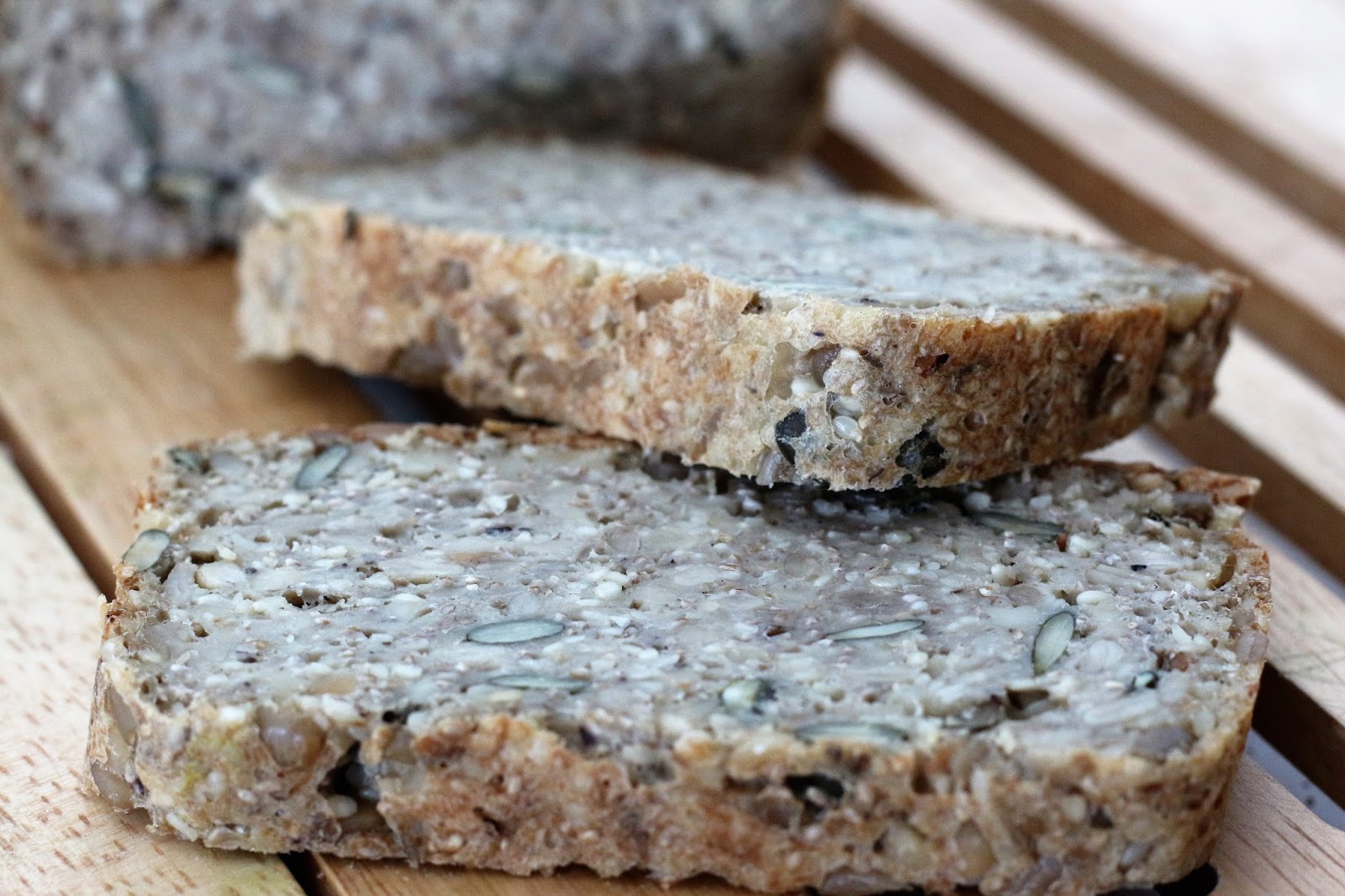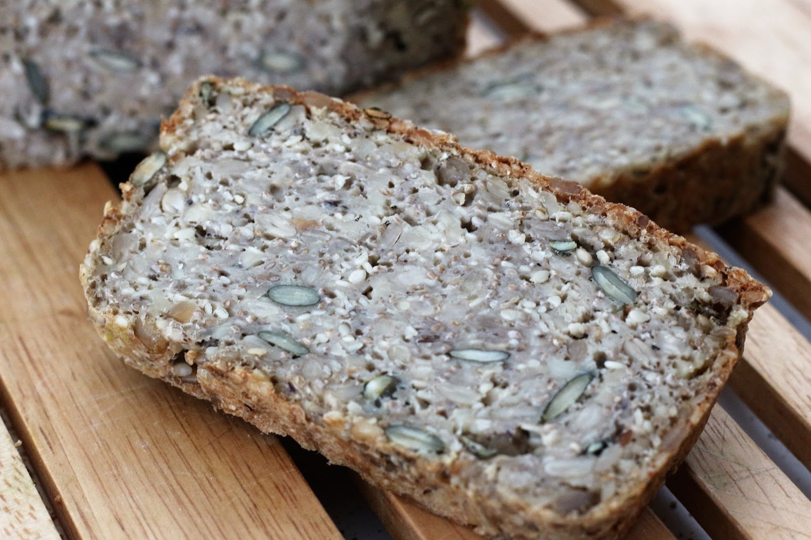 Helppo ja nopea valmistaa, ei leipomista eikä yleiskoneita- ai niin ja käsiä ei tarvitse sotkea?? Kuulostaako tutulta? Tämäkin leipäohje noudattelee blogin muita leipäohjeita ja tämä onkin blogin 28. leipäohje, joka sopii erikoisruokavalioita noudattaville. Blogin muita leipäohjeitä löydät täältä. Leivän maku ja rakenne ovat vaatimattomasti sanottuna täydellisiä??? Lisäksi leipä on superterveellinen, sillä se pursuaa hyviä rasvahappoja (siemenet ja pähkinärouhe) ja kuituja. Kuitujen merkitystä tuskin voi tarpeeksi korostaa gluteenittomassa ja muissakin ton ton ruokavalioissa. Olen niin paljon kirjoitellut muiden ohjeiden yhteydessä kuitujen merkityksestä, mutta vielä kertauksen vuoksi lyhyesti: monimuotoiset kuidut edistävät suolen toimintaa ja muokkaavat myös sokeri- ja rasva-aineenvaihduntaa terveyttä edistävään suuntaan. Kuitu turpoaa suolistossa ja sitoo itseensä myrkkyjä ja epäpuhtauksia, kuljettaa ulostemassaa nopeammin paksusuolessa ja on ravintoa suoliston hyville bakteereille. Kuitu onkin elintärkeää suoliston hyvinvoinnille ja mikäli ruokavalio on riittävän kuitupitoinen ulosteesta tulee pehmeämpää ja vatsa toimii säännöllisesti. Runsaskuituista ravintoa nauttineilla on pienentynyt riski sairastua moniin sairauksiin kuten 2. tyypin diabeetekseen.