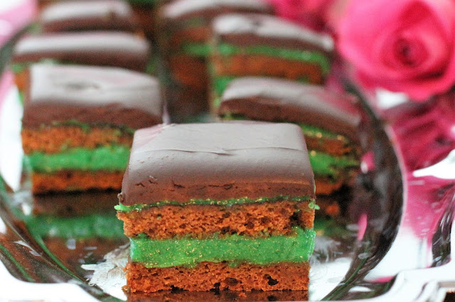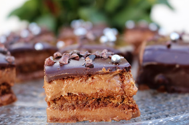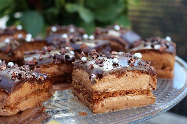 Ota jähmettynyt mokkaseos jääkaapista ja levitä täyte yhden pohjan päälle. Jaa pohja neljään osaan. Lisää pohjan päälle täytettä ja laita täytteen päälle pohja. Eli ikäänkuin täyttäisit täytekakkua. Kääri leivos tiukasti leivinpaperin sisään ja laita hetkeksi jääkaappiin vetäytymään. Kuorruta jäähtyneellä kuorrutteella, koristele ja laita leivokset jääkaappiin vetäytymään muutamaksi tunniksi. Paloittele leivokset haluamasi kokoisiksi paloiksi. Säilytä leivokset jääkaapissa, jossa ne säilyvät muutaman päivän.